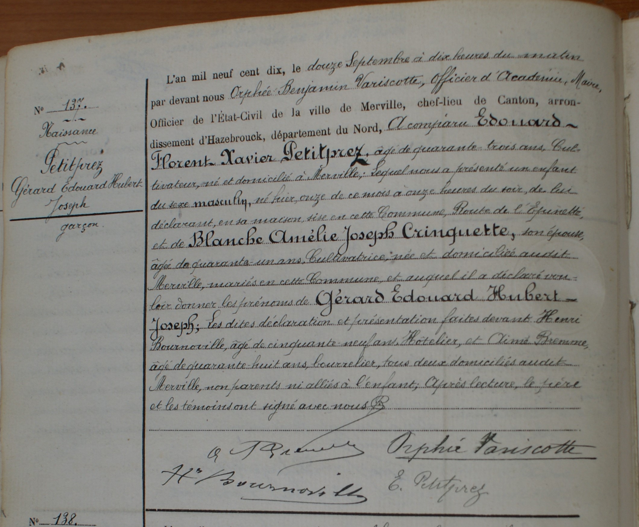 Prénom: Gerard Edouard Hubert Joseph Gerard Edouard Hubert Joseph | Nom: PETITPREZ PETITPREZ