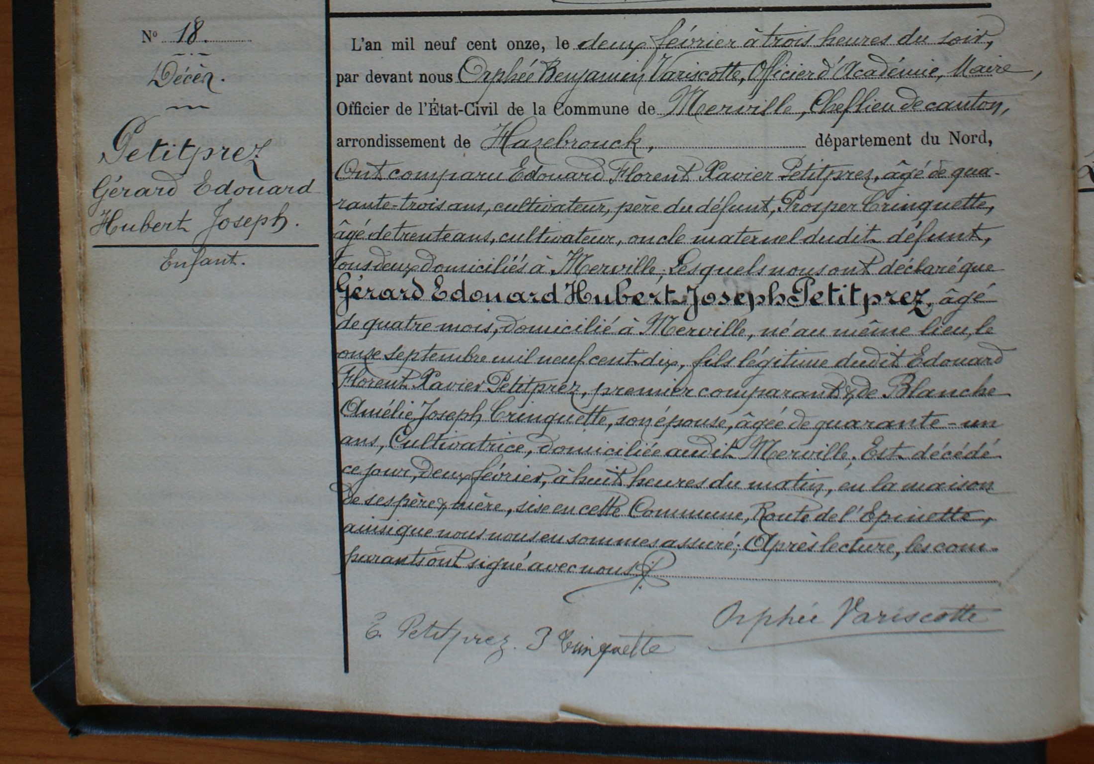 Acte de naissance de Gerard Edouard Hubert Joseph PETITPREZ Décès Jeudi 02 fév 1911 Merville, 59660, Nord, Hauts-de-France, France
