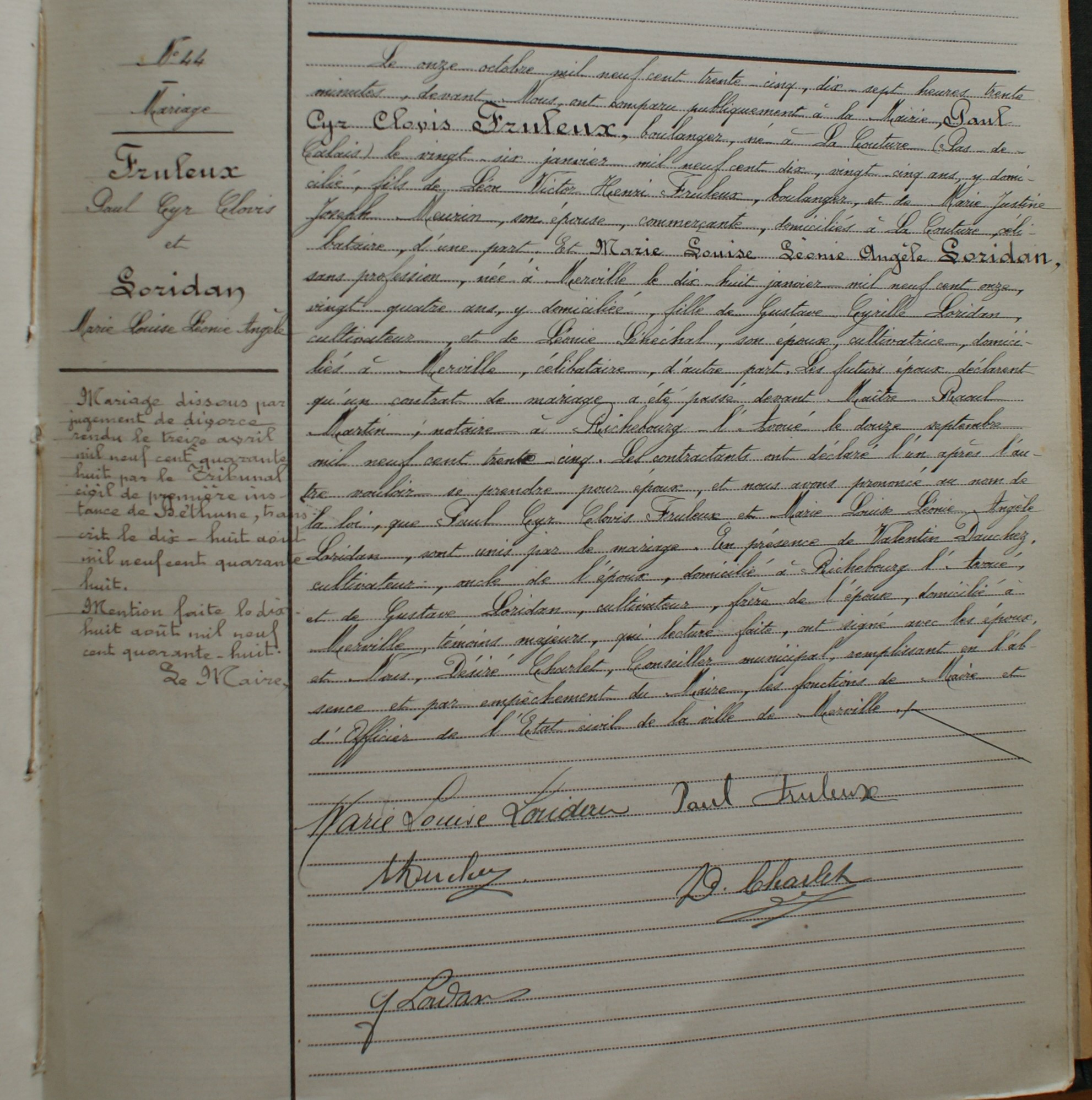 Acte de mariage de Paul Cyr Clovis FRULEUX + Marie-Louise Léonie Angèle LORIDAN Age au mariage Lui : 25 ans et 9 mois - Elle : 24 ans et 9 mois. Divorce Mardi 13 avr 1948 Béthune, 62400, Pas-de-Calais, Hauts-de-France, France