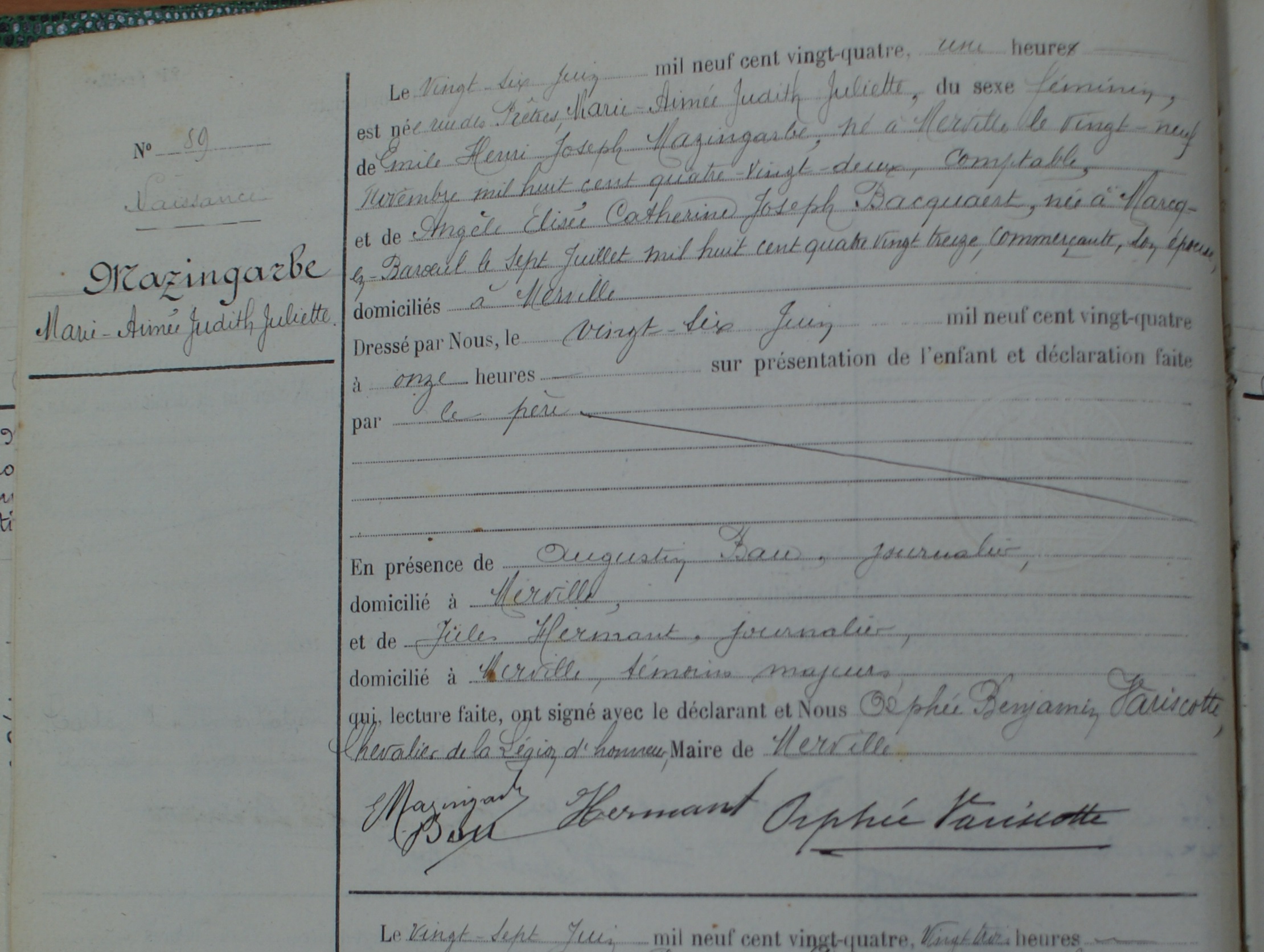 Nom MAZINGARBE Marie Aimee Judith Juliette Parenté