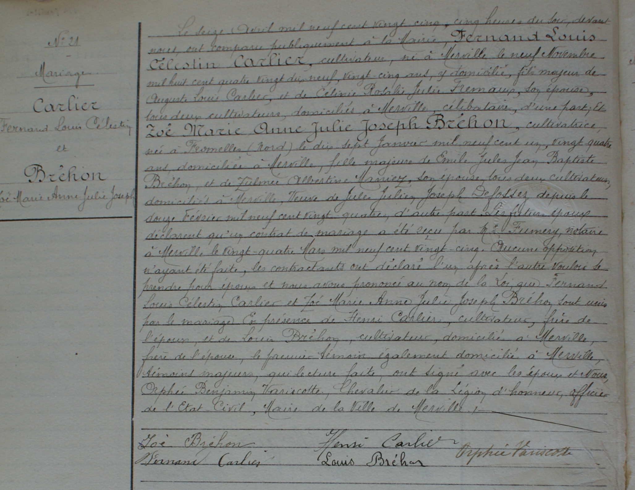 Acte de mariage de Fernand Louis Celestin CARLIER + Zoe Marie Anne Julie Joseph BREHON Age au mariage Lui : 25 ans et 5 mois - Elle : 24 ans et 3 mois. ID Famille F000532 Feuille familiale | Tableau familial