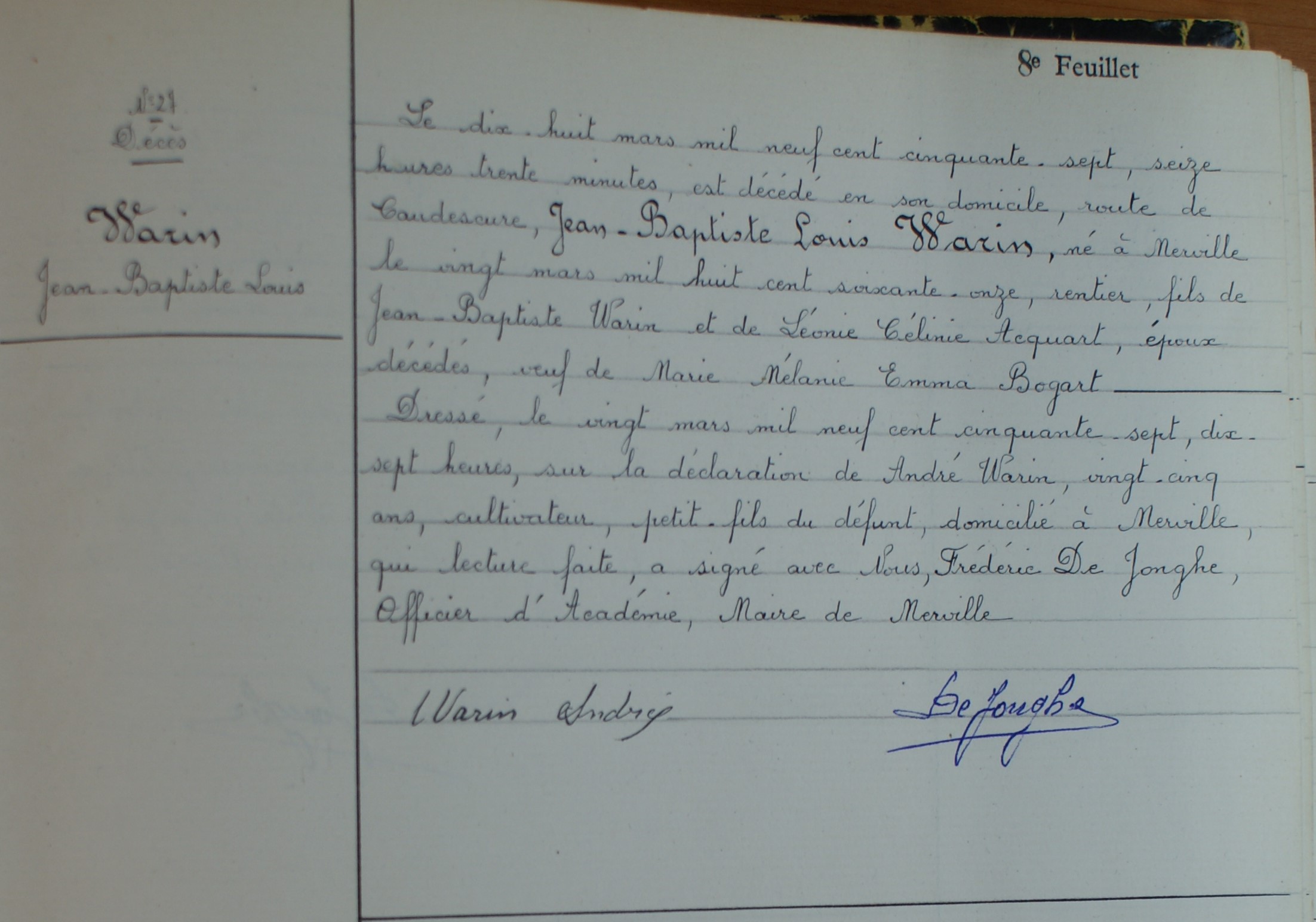 Acte de naissance de Jean-Baptiste Emile Joseph WARIN Décès Lundi 18 mars 1957 Caudescure, 59660, Nord, Hauts-de-France, France