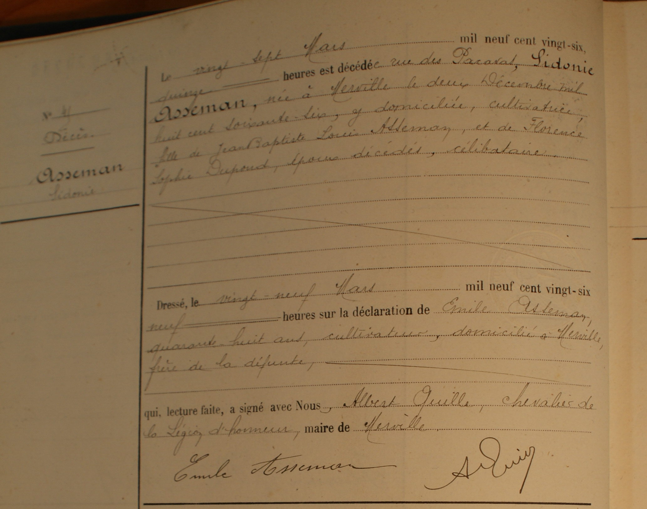 Acte de naissance de Sidonie ASSEMAN DécèsSamedi 27 mars 1926 Merville, 59660, Nord, Hauts-de-France, France