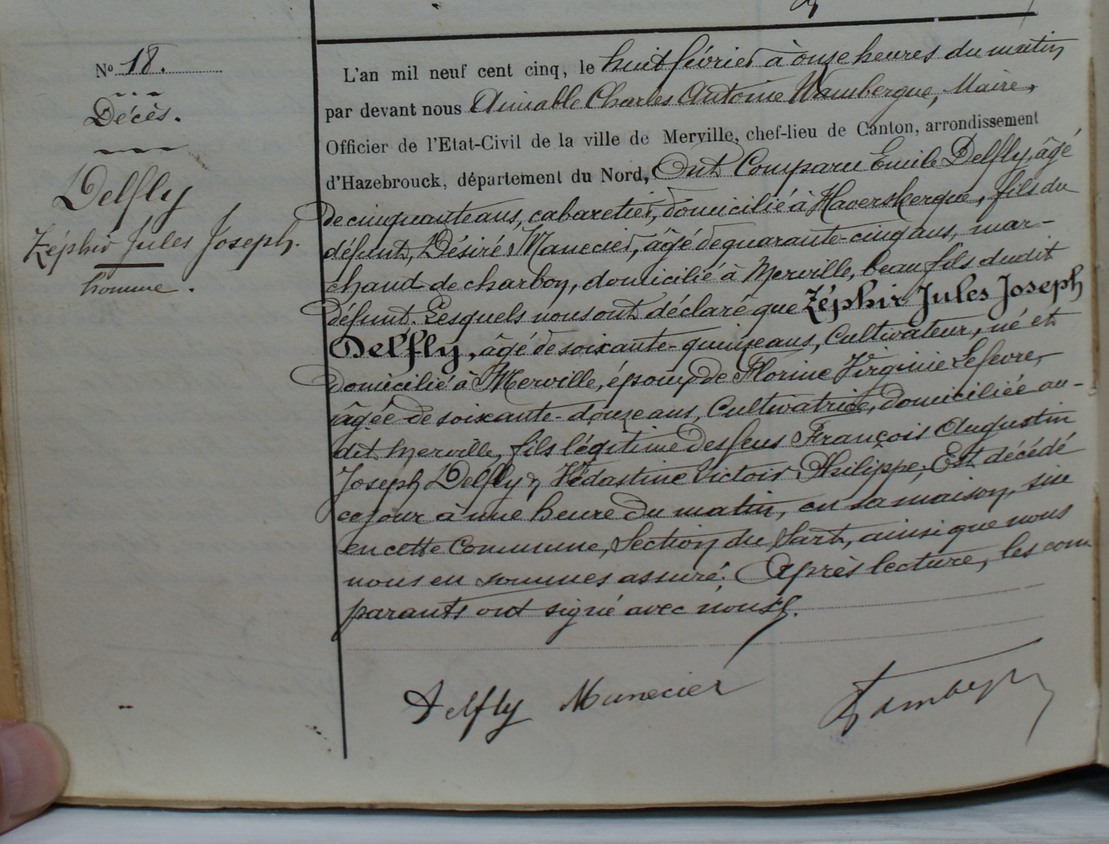 Acte de naissance de Zéphir Jules DELFLY ProfessionCultivateur DécèsMercredi 08 fév 1905 Le Sart, Merville, 59660, Nord, Hauts-de-France, France Hameau de Merville (59660)