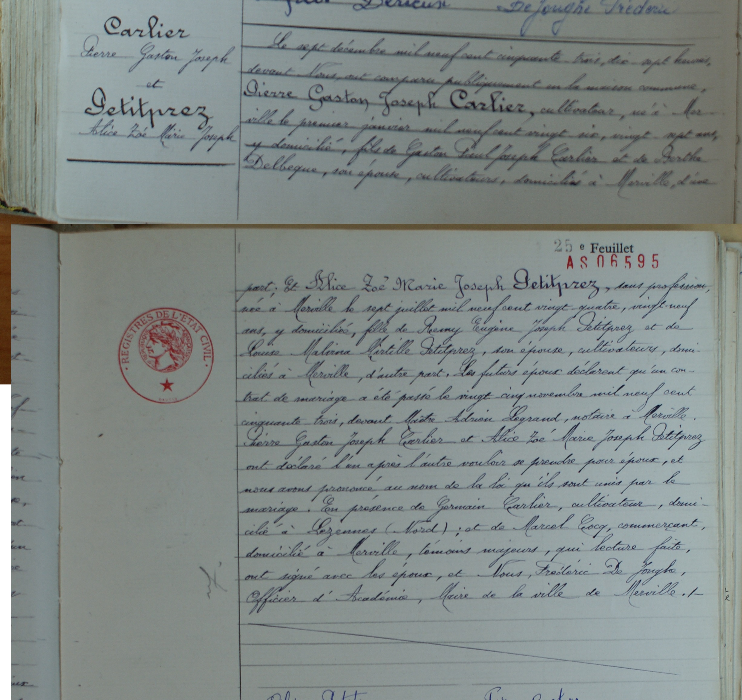 ▻ PETITPREZ Marie Therese Julia Albertine , m. Lundi 02 mai 1949> 2. CARLIER Pierre Gaston Joseph, n. Vendredi 01 jan 1926, Merville, 59660, Nord, Hauts-de-France, France